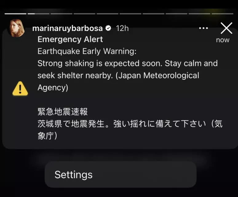 Imagina que você vai tirar férias em família e de repente recebe um alerta de terremoto no celular. Foi isso exatamente que aconteceu com a atriz Marina Ruy Barbosa, que está passando suas férias no Japão. Ela foi surpreendida com o aviso de emergência sobre o abalo sísmico que atingiu o país e publicou sua reação nas redes sociais.