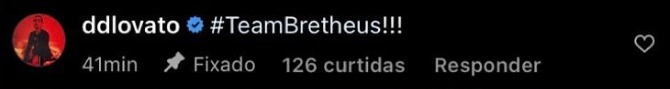 Olha só, hein? O Power Couple Brasil ganhou notoriedade internacional sendo percebido até pela cantora Demi Lovato, por essa eu não esperava. A cantora deixou sua torcida para o casal Brenda e Matheus. Demi comentou a publicação do casal: “#teamBretheus”.