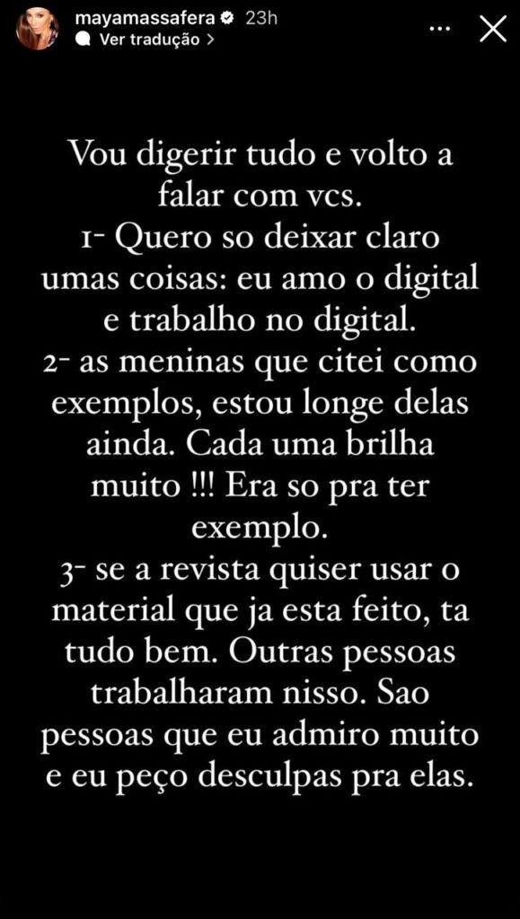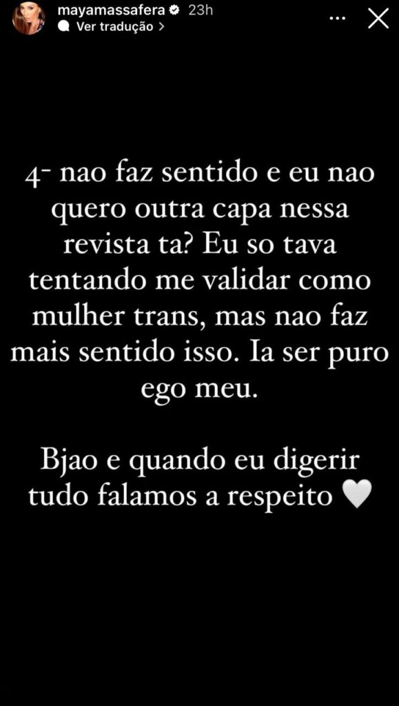 Em suas recentes publicações no Instagram, Maya deixou claro que respeita o trabalho de outros profissionais que atuaram no ensaio. “São pessoas que eu admiro muito e eu peço desculpas pra elas. Eu só tava tentando me validar como mulher trans, mas não faz mais sentido isso. Ia ser puro ego meu”, declarou.