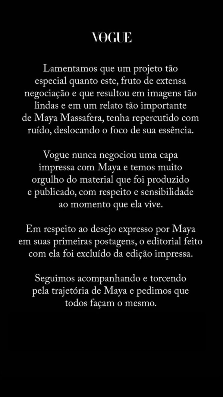 “Vogue nunca negociou uma capa impressa com Maya e temos muito orgulho do material que foi produzido e publicado, com respeito e sensibilidade ao momento que ela vive”.