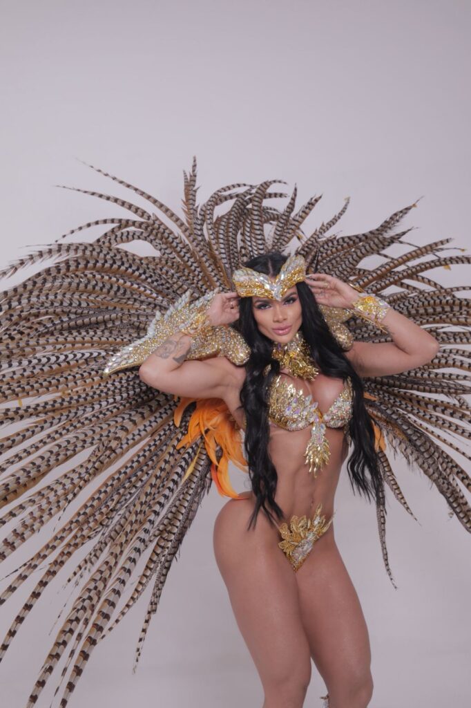 No bastidor, a conversa ficou ainda mais saborosa. Raíssa contou que fraturou seis costelas em procedimento estético para reduzir a cintura e ganhou 16 centímetros de bumbum com remodelação corporal. Para chegar “seca” no dia do desfile, adotou a cartilha clássica do fisiculturismo competitivo. Começou bebendo seis litros de água por dia e comendo apenas 50 gramas de arroz. Depois, a água diminui, o arroz aumenta e o corpo responde rápido, segundo ela, com músculos mais aparentes e zero retenção.
