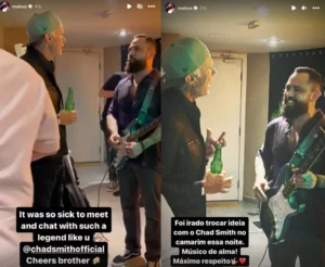 O baterista ainda fez questão de ir ao camarim para falar com Mateus, que não escondeu a admiração pelo músico. “Foi irado trocar ideia com o Chad Smith no camarim essa noite. Músico de alma. Máximo respeito”, escreveu.