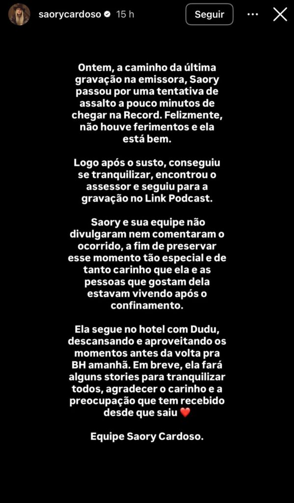 Por meio de sua equipe, Saory confirmou o ocorrido, garantiu que não houve ferimentos e explicou o silêncio inicial. O choque foi grande e a escolha foi não transformar o medo em espetáculo instantâneo. Primeiro, respirar. Depois, falar.
