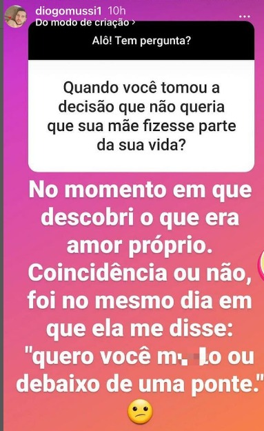 Diogo não deixou de responder com sinceridade: “No momento em que descobri o que era amor próprio. Coincidência ou não, foi no mesmo dia em que ela me disse: ‘quero você morto ou debaixo de uma ponte’“, escreveu.