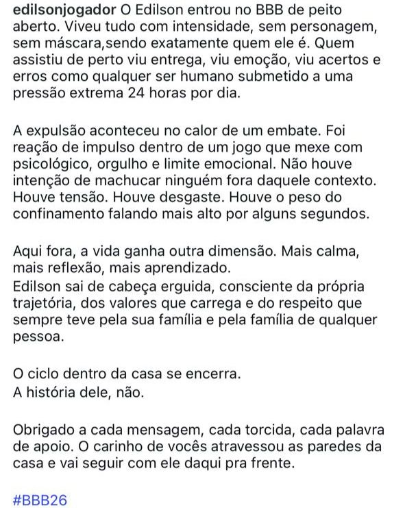 Aqui fora, a estratégia mudou de roupa em tempo recorde. O texto publicado no perfil do ex jogador veio com tom de manifesto emocional, desses que tentam organizar o caos com palavras bonitas. Fala de intensidade, pressão psicológica, impulso, aprendizado e vida que segue fora das paredes cenográficas. Eu li tudo com olhar clínico de quem já viu esse filme várias vezes, sempre com o mesmo roteiro e figurino repaginado.