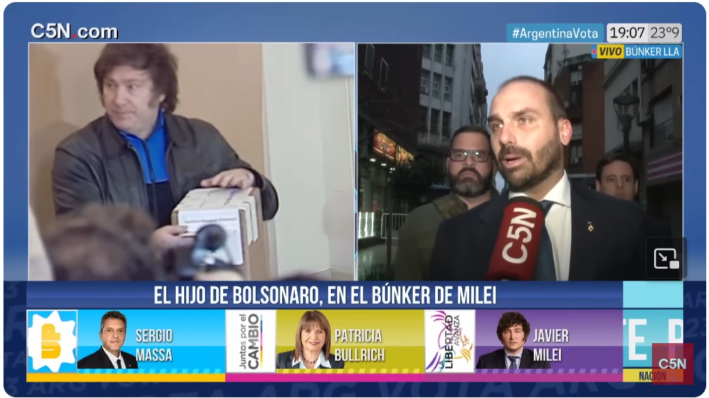 “Eu acredito que Javier Milei tem todas as condições de colocar a diante esta política (semelhante à do governo Jair Bolsonaro) na Argentina, porque não há motivo para que o Brasil seja assim e a Argentina esteja em crise”, disse Eduardo ao chegar no comitê de campanha de Milei. “Colocar adiante armas de fogo nas mãos dos cidadãos significa dar condições de que tenham a legítima defesa”, prosseguiu.