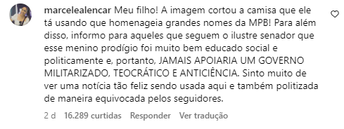“Meu filho! A imagem corou a camisa que ele tá usando que homenageia grandes nomes da MPB! Para além disso, informo para aquele que segue o ilustre senador que esse menino prodígio foi muito bem educado social e politicamente e, portanto, JAMAIS APOIARIA UM GOVERNO MILITARIZADO, TEOCRÁTICO E ANTICIÊNCIA. Sinto muito de ver uma notícia tão feliz sendo usada aqui e também politizada de maneira equivocada pelos seguidores”, disse.