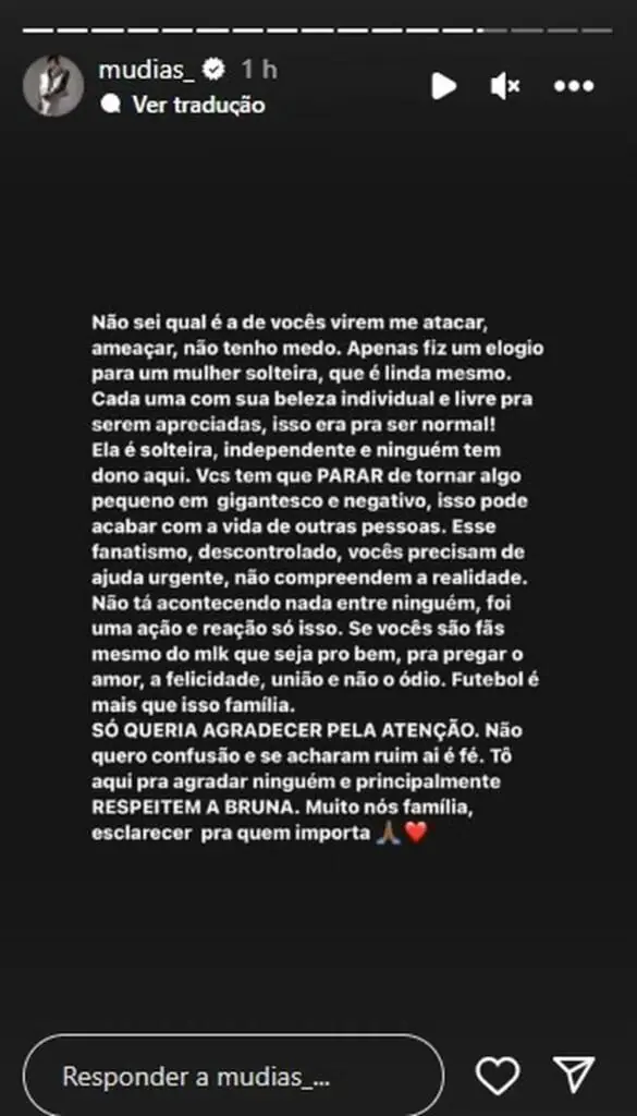 O modelo enfatizou que apenas fez um elogio a uma mulher solteira, respeitando a individualidade e liberdade de cada pessoa para ser apreciada. destacou a independência e solteirice de Bruna, salientando que ninguém pertence a ninguém.