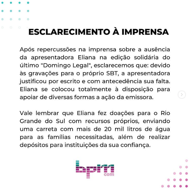 “Após repercussões na imprensa sobre a ausência da apresentadora Eliana na edição solidária do último “Domingo Legal”, esclarecemos que: devido às gravações para o próprio SBT, a apresentadora justificou por escrito e com antecedência sua falta. Eliana se colocou totalmente à disposição para apoiar de diversas formas a ação da emissora”, iniciou o comunicado, que ressaltou: “Vale lembrar que Eliana fez doações para o Rio Grande do Sul com recursos próprios, enviando uma carreta com mais de 20 mil litros de água para as famílias necessitadas, além de realizar depósitos para instituições de sua confiança”.