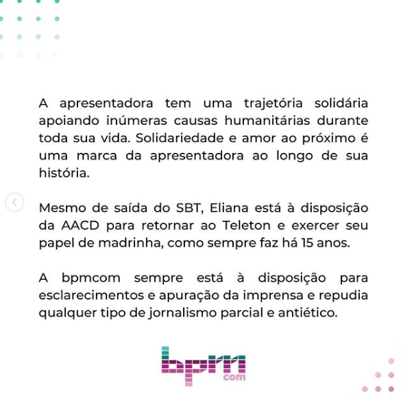 “A apresentadora tem uma trajetória solidária apoiando inúmeras causas humanitárias durante toda a sua vida. Solidariedade e amor ao próximo é uma marca da apresentadora ao longo de sua história. Mesmo de saída do SBT, Eliana está à disposição da AACD para retornar ao Teleton e exercer seu papel de madrinha, como sempre faz há 15 anos”, finalizou a assessoria da apresentadora.