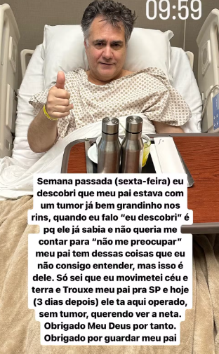 “Semana passada (sexta-feira), descobri que meu pai estava com um tumor já bem grandinho nos rins. Quando eu falo ‘descobri’, é porque ele já sabia e não queria me contar para ‘não me preocupar’. Meu pai tem dessas coisas que eu não consigo entender, mas isso é dele. Só sei que movimentei céu e terra e trouxe o meu pai para São Paulo e hoje (3 dias depois), ele está aqui operado, sem tumor, querendo ver a neta. Obrigado, meu Deus, por tanto. Obrigado por guardar o meu pai”, publicou o ex-BBB.