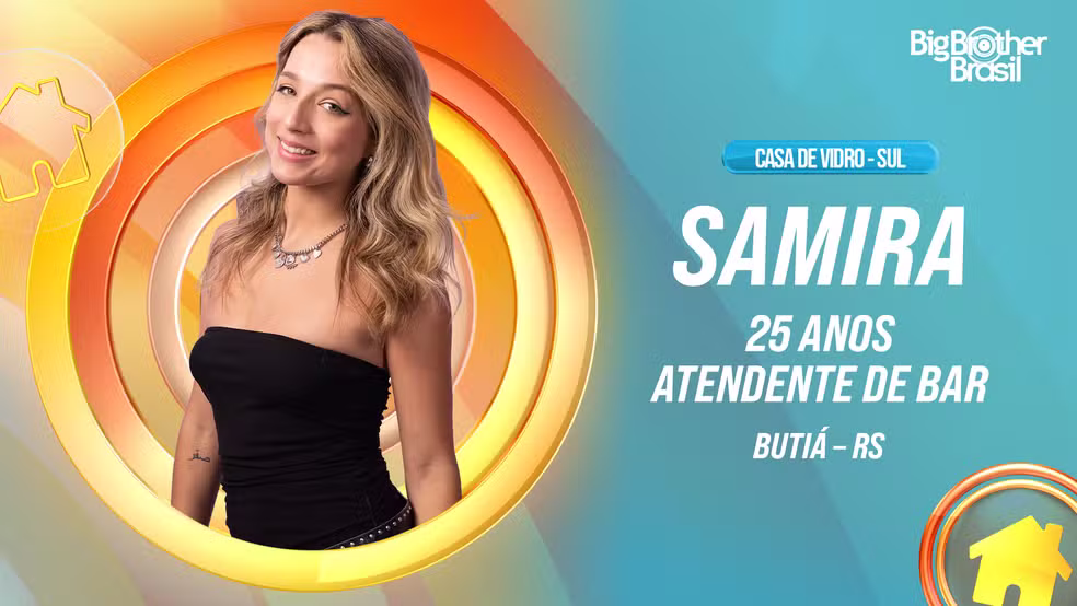 Estudante de Direito, 25 anos, criada entre o Rio Grande do Sul e Santa Catarina. Samira é comunicação pura, com intensidade e caos assumidos. Sempre teve que provar que merecia estar onde estava, foi bolsista, batalhou e hoje divide a rotina entre hostel, bar e sonhos grandes. Estilo próprio, personalidade marcante e fama de patricinha que ela garante não se sustentar. No BBB, promete entregar tudo, emoção, conflito e verdade. Diz que é tudo ou nada. E parece falar sério.