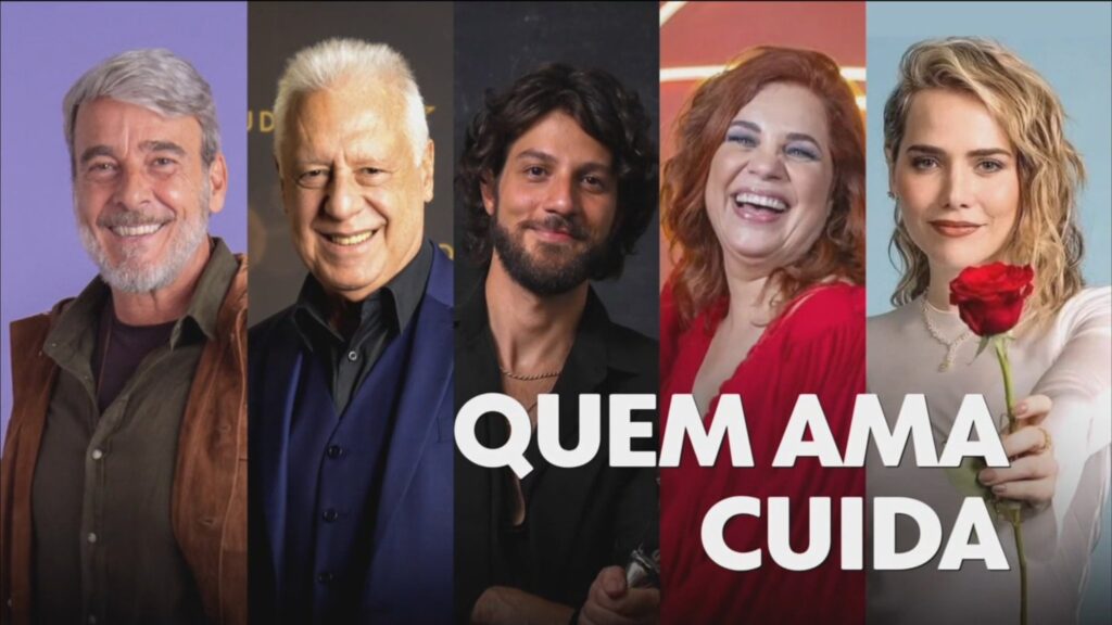 No horário nobre, a chamada confirmou “Quem Ama Cuida” como a próxima novela das 21h, substituindo “Três Graças”. Escrita por Walcyr Carrasco e Cláudia Souto, a produção foi destacada com uma arte especial reunindo parte do elenco principal, entre eles Chay Suede, Alexandre Borges, Antônio Fagundes, Letícia Colin e Isabel Teixeira, reforçando a aposta da emissora em um elenco de peso.
