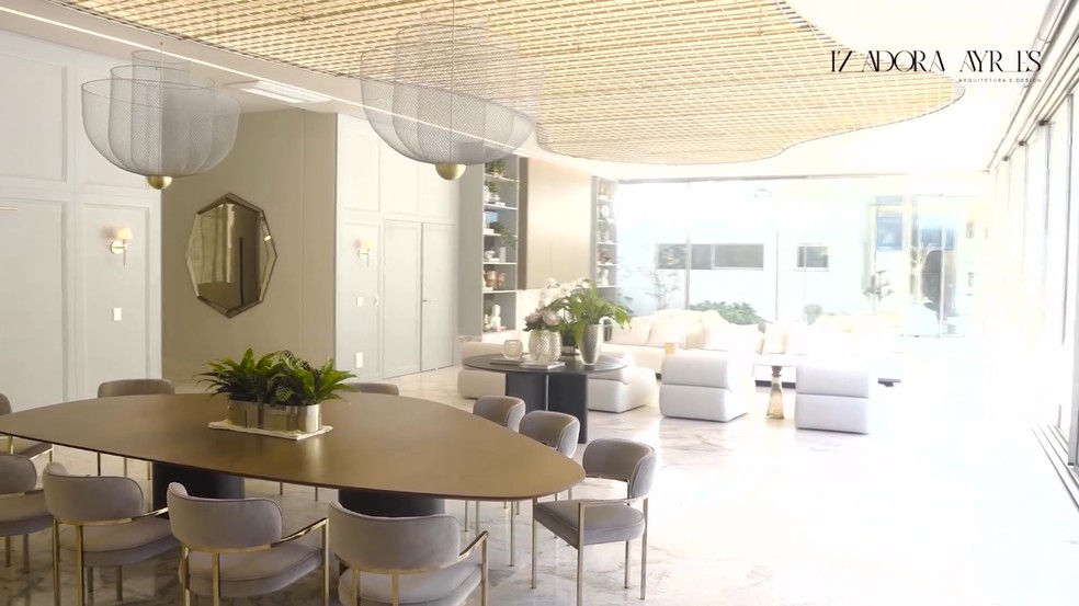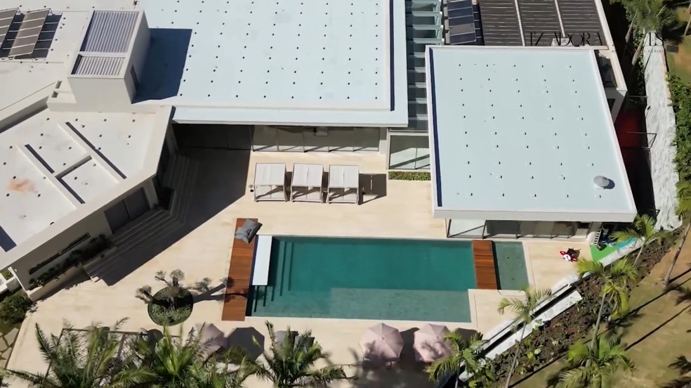 A luxuosa mansão ainda tem: elevador, ofurô com borda infinita, sala de cinema, cozinha com ilha de mármore, escritório e muito mais.