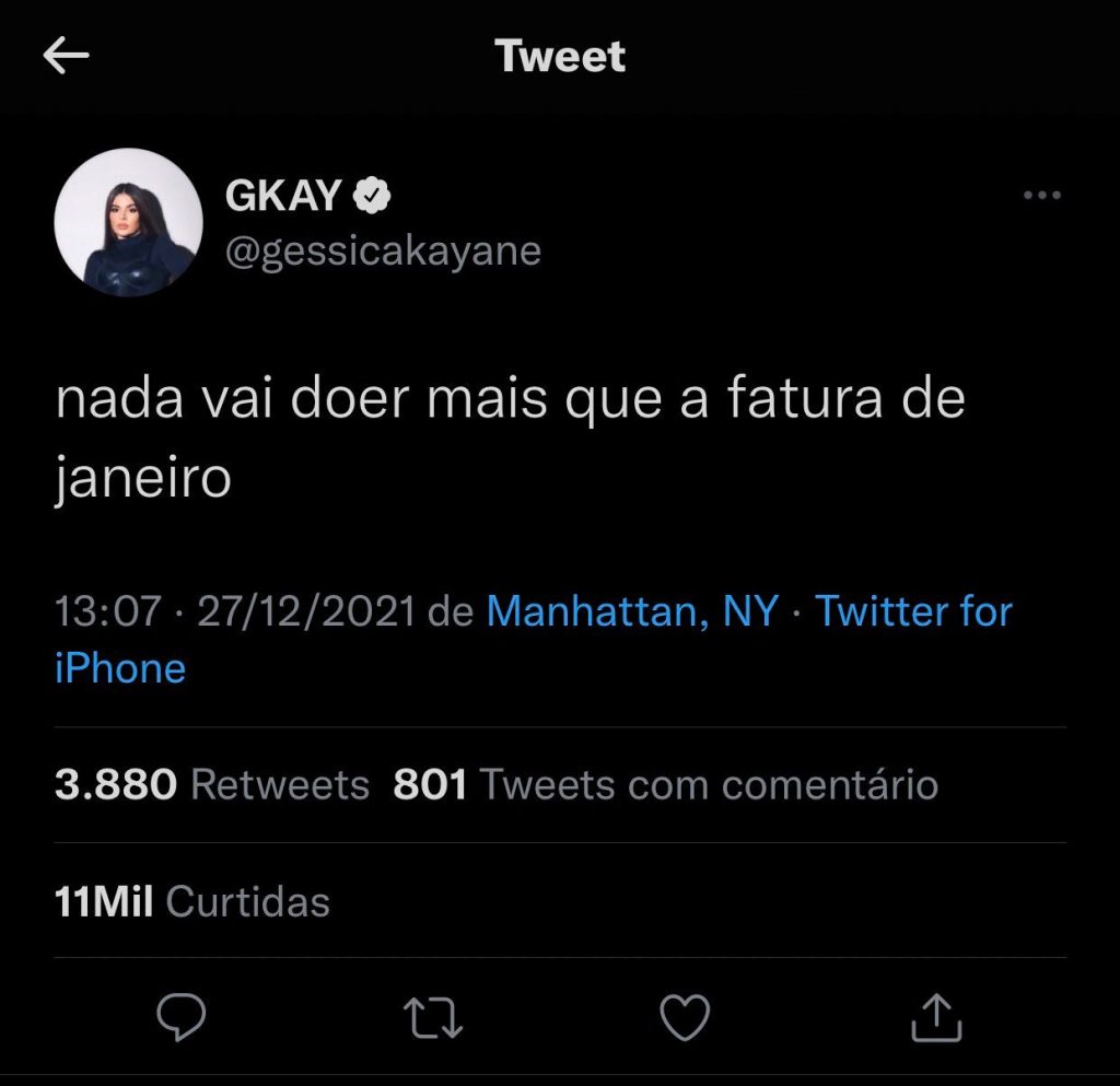 Gkay também postou um tweet falando de uma das maiores preocupações dos brasileiros no período de festas de fim de ano, a fatura do cartão de crédito em janeiro e escreveu: “nada vai doer mais que a fatura de janeiro”.