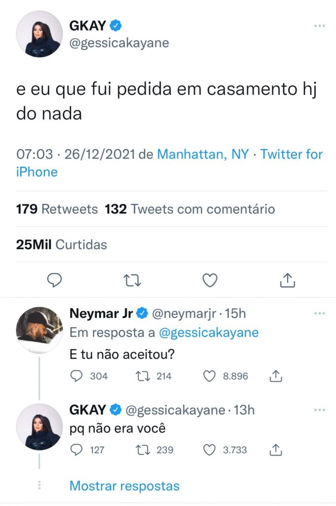 A humorista postou em sua rede social: “E eu que fui pedida em casamento ontem, do nada”. Logo o jogador respondeu para ela: “E você não aceitou?” Gkay, mais rápida que um raio, logo mandou para Neymar que só não havia aceitado o pedido porque o pretendente não era ele.