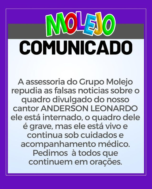 “A assessoria do Grupo Molejo repudia as falsas notícias sobre o quadro divulgado do nosso cantor Anderson Leonardo. Ele está internado, o quadro dele é grave, mas ele está vivo e continua sob cuidados e acompanhamento médico. Pedimos a todos que continuem em orações”, publicou a assessoria do cantor.