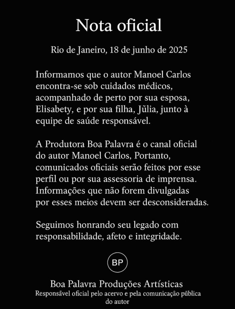 A atriz Júlia Almeida, filha do dramaturgo, usou as redes sociais nesta sexta-feira, 18, para atualizar o público sobre o estado de saúde do pai, que passou por uma internação em janeiro após uma piora no quadro motor e cognitivo. “Informamos que o autor Manoel Carlos encontra-se sob cuidados médicos, acompanhado de perto por sua esposa, Elisabety, e por sua filha, Julia, junto à equipe de saúde responsável”, afirmou o comunicado.