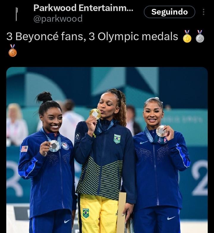 Beyoncé celebrou o primeiro pódio de mulheres negras no solo da ginástica. A conta da empresa da cantora comentou: “3 fãs da Beyoncé, 3 medalhas olímpicas”, destacando a importância histórica do momento.