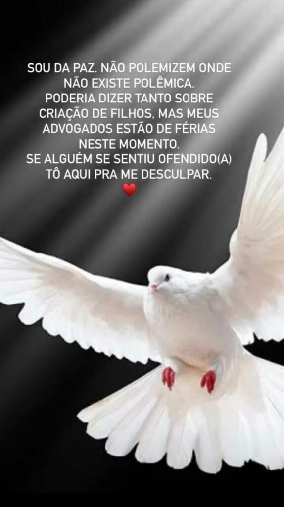 “Sou da paz. Não polemizem onde não existe polêmica. Poderia dizer tanto sobre criação de filhos, mas meus advogados estão de férias neste momento. Se alguém se sentiu ofendido (a), tô aqui para me desculpar”, disse o jornalista.