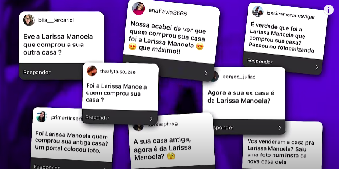 “Por que eu tenho que falar sobre isso? Eu vi uma das pessoas aqui falando ‘quer dizer que você vendeu a casa pra Larissa Manoela e não contou nada pra gente?’. Por que eu tinha que chegar e falar aqui pra vocês ‘gente, olha aqui quem comprou minha casa?’. Não!”, iniciou a influenciadora.