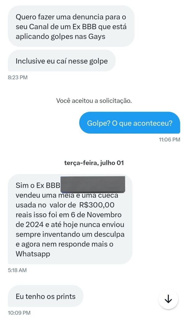 Parece que tem um ex-BBB que anda dando golpes pela internet a fora; pois, essa pessoa anunciou que estavam vendendo meias e cueca usadas por apenas 300 reais. Socoorrroooo Deuuus, cadê meus advogados que não respondem minhas mensagens no Whatsapp para eu não correr risco de tomar um belo processinho?