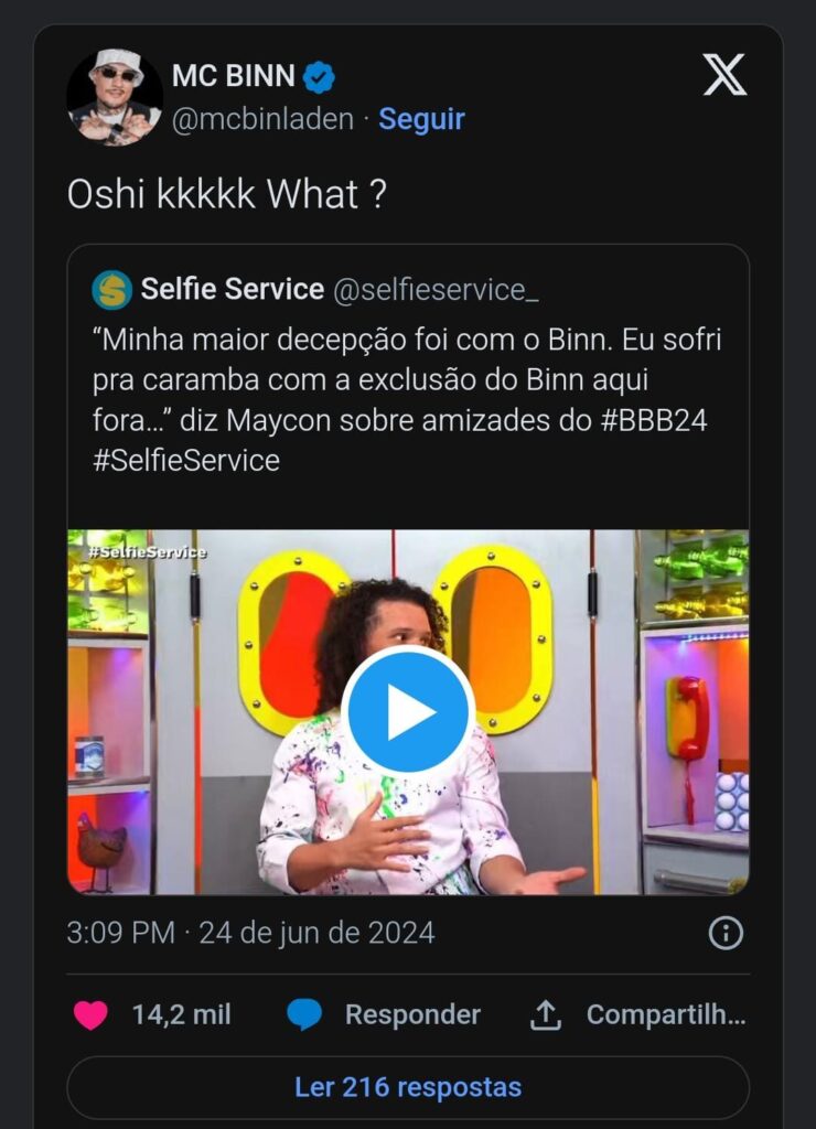 De toda essa confusão, o que mais marcou foi Binn ter feito uma publicação polêmica e simples no X, antigo twitter. Binn repostou o vídeo da entrevista de Maycon, dizendo: “Oshi kkkkk What?”