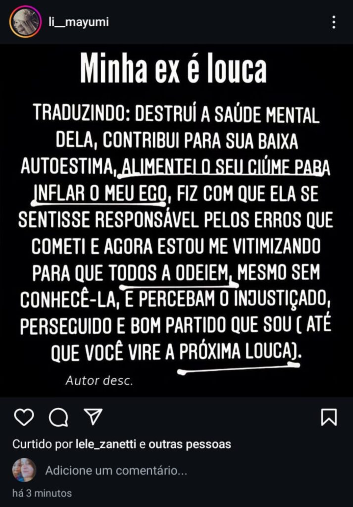 TRADUZINDO: DESTRUÍ A SAÚDE MENTAL DELA, CONTRIBUI PARA SUA BAIXA AUTOESTIMA, ALIMENTEI O SEU CIÚME PABA INFLAR O MEU EGO, FIZ COM QUE ELA SE SENTISSE RESPONSÁVEL PELOS ERROS QUE COMETI E AGORA ESTOU ME VITIMIZANDO PARA QUE TODOS A ODEIEM, MESMO SEM CONHECÊ-LA, E PERCEBAM O INJUSTIÇADO, PERSEGUIDO E BOM PARTIDO QUE SOU (ATÉ QUE VOCÊ VIRE A PRÓXIMA LOUCA).”