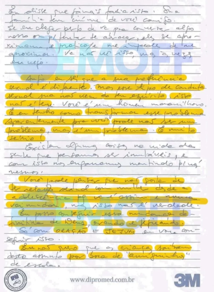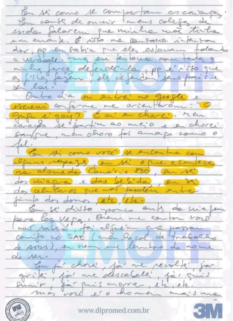 “ Eu sei como você se encontra com alguns rapazes, eu sei o que acontece na Alameda Canário, 830. Eu sei dos viagras e das bebidas, eu sei dos celulares que não podem entrar junto com os donos, etc (…) Sei de muitas coisas sobre seu homossexualismo, já quis saber da sua boca, mas não foi possível porque você nega terrivelmente “.
