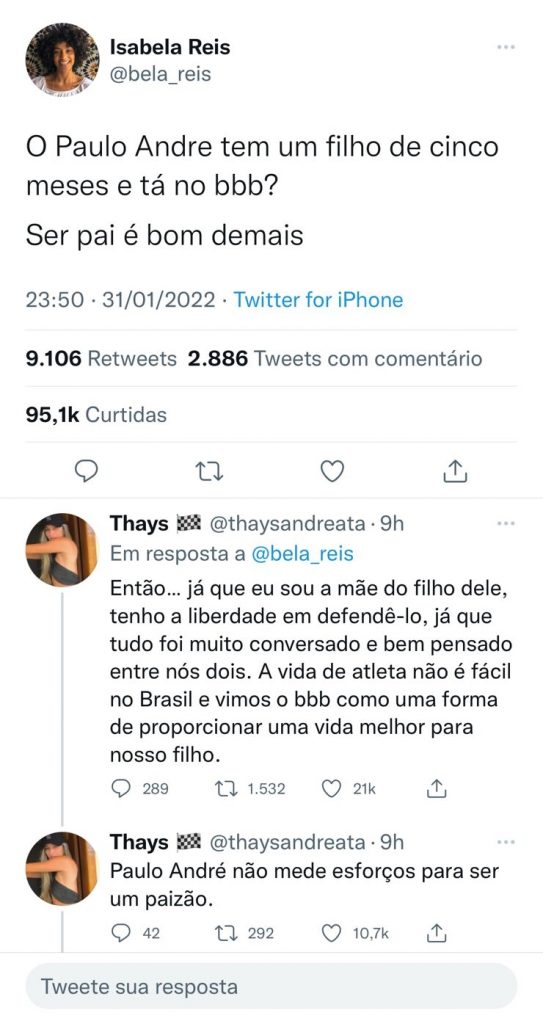 O tweet que que foi escrito por Isabela Reis e carrega mais de 95 mil curtidas foi rebatido pela mãe do filho do atleta, que explicou para a biscoiteira: “Então… já que sou a mãe do filho dele, tenho a liberdade de defende-lo, já que tudo foi muito bem pensado e conversado entre nós dois. A vida de atleta não é fácil no Brasile vimos o BBB como uma forma de proporcionar uma vida melhor para nosso filho.”