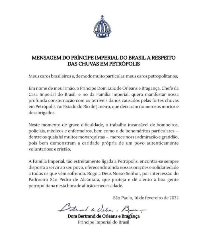 A Família Imperial coloca à disposição suas orações como consolo para as diversas famílias que tiveram suas vidas destruídas pelas chuvas em Petrópolis. Qualquer um fez e faz mais que eles, mas o título só eles tem, me poupe de tanta baboseira.