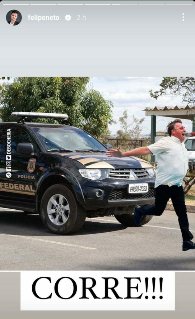 Já nos stories de seu instagram, Felipe publicou uma montagem, onde o ex-presidente aparece correndo de uma viatura da polícia federal, com a seguinte legenda: “CORRE!!!”.