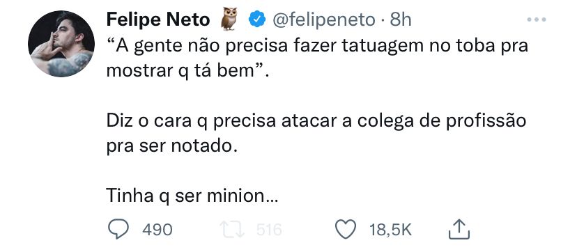 “A gente não precisa fazer tatuagem no toba pra mostrar q tá bem”. Diz o cara que precisa atacar a colega de profissão para ser notado. Tinha q ser minion…”, escreveu Felipe Neto.
