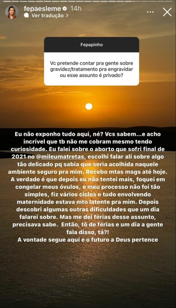 “Eu falei sobre o aborto que sofri final de 2021 no Podcast Mil e Uma Tretas, escolhi falar ali sobre algo tão delicado porque sabia que seria acolhida naquele ambiente seguro pra mim. Recebo muitas mensagens até hoje. A verdade é que depois eu não tentei mais, foquei em congelar meus óvulos, e meu processo não foi tão simples, fiz vários ciclos e tudo envolvendo maternidade estava muito latente pra mim. Depois descobri algumas outras dificuldades que um dia falarei sobre”, explicou a apresentadora.