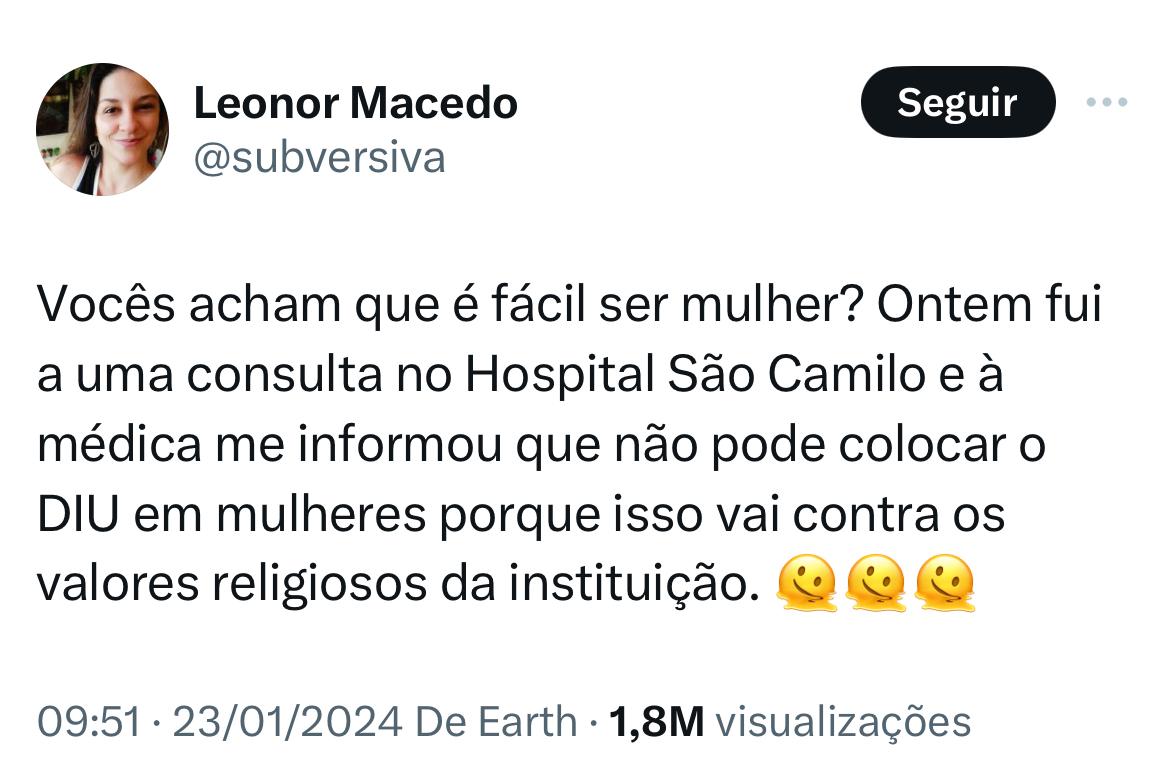 Gente, que absurdo!!! Olha só a situação que a criadora de conteúdo Leonor Macedo revelou nas redes sociais que não conseguiu realizar o procedimento de inserção do DIU (dispositivo intrauterino). Ela relatou que o hospital São Camilo informou que o procedimento “vai contra os valores religiosos da instituição”.