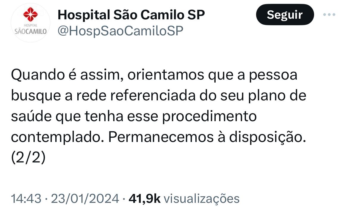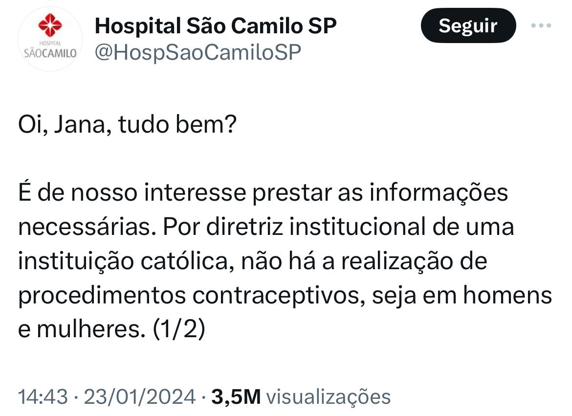 Em outra publicação, ela narra que o hospital São Camilo ligou para explicar que a instituição não realiza procedimentos como DIU e vasectomia.