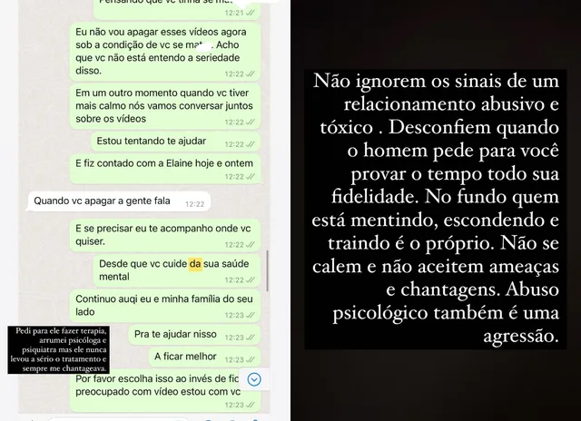 “Pedi para ele fazer terapia, arrumei psicóloga e psiquiatra, mas ele nunca levou a sério o tratamento e sempre me chantageava. Não ignorem os sinais de um relacionamento abusivo e tóxico. Desconfiem quando o homem pede para você provar o tempo todo sua fidelidade. No fundo quem está mentindo, escondendo e traindo, é o próprio. Não se calem e não aceitem ameaças e chantagens. Abuso psicológico também é uma agressão”, finalizou a ex-BBB.