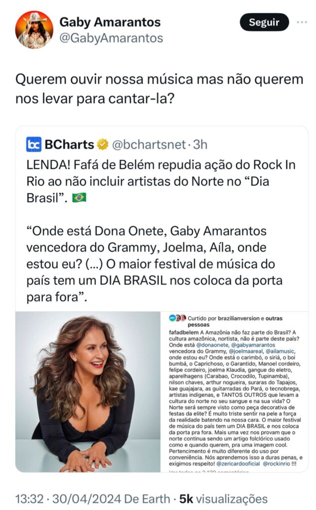 Por fim, a artista completou: “O Norte será sempre visto como peça decorativa de festas da elite? É muito triste sentir na pele a força da realidade batendo na nossa cara. O maior festival de música do país tem um DIA BRASIL e nos coloca da porta pra fora. Mais uma vez nos provam que o norte continua sendo um artigo folclórico usado como e quando querem, pra uma imagem cool. Pertencimento é muito diferente do uso por conveniência. Nós aprendemos isso a duras penas, e exigimos respeito!”