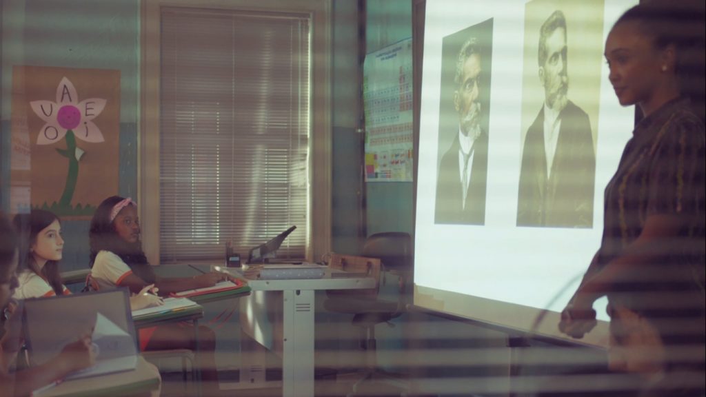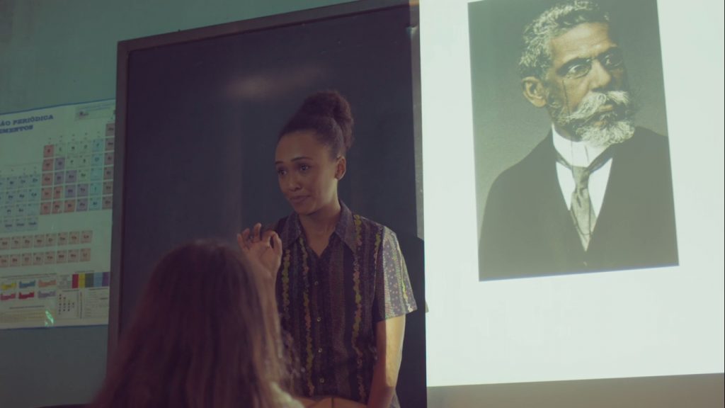 Na cena em questão uma aluna pergunta: “Mas Machado de Assis era Branco ou Negro?” Rapidamente a professora responde: “Negro!”