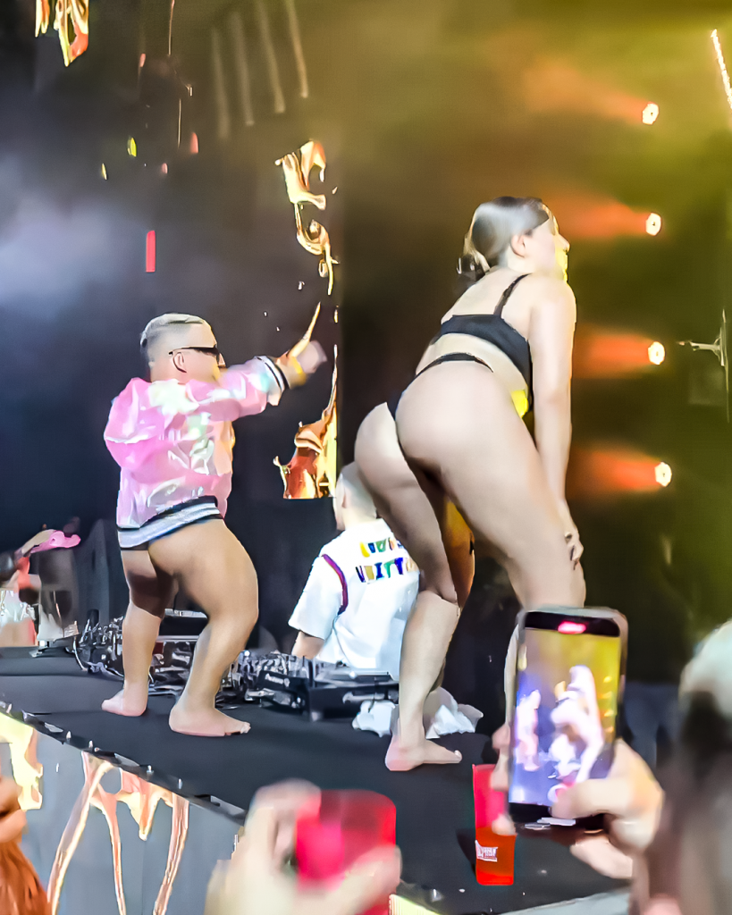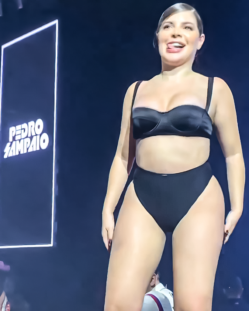 A humorista e influenciadora digital foi acompanhada por Tokinho, que também usava um fio dental. O ponto alto foi quando Pedro Sampaio colocou nas pick ups a introdução de “Crazy In Love” da cantora Beyoncé. A dupla desfilou em cima do balcão e levou a galera à loucura!