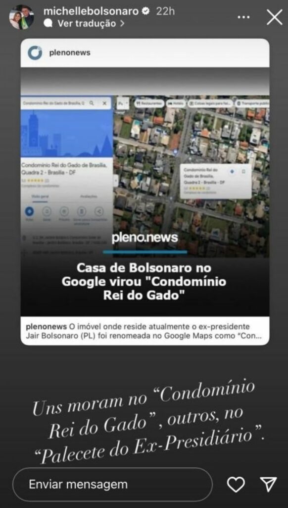 Amores, na última terça-feira (25), viralizou na web a renomeação de um condomínio, que fica localizado no no bairro Jardim Botânico, da capital brasileira, no aplicativo Google Maps. O condomínio, onde reside o ex-presidente Jair Bolsonaro, teve o seu nome trocado no aplicativo, deixando de ser “Condomínio Solar de Brasília”, para se tornar “Condomínio Rei do Gado”.