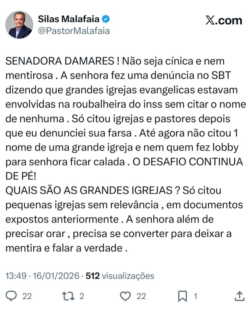 Malafaia ouviu, respirou fundo e entrou no modo ataque total. Vídeos, posts, lives, aquela coisa toda. Chamou Damares de leviana, linguaruda e agora cínica, exigiu nomes, provas, CPF, RG e até batismo autenticado. Disse que ela mancha os evangélicos, que joga política em cima da fé e que não merece o crachá gospel. Tradução do drama, mexeu no cofre, mexeu com o nervo.