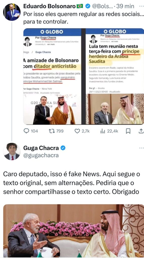 “Por isso eles querem regular as redes sociais… Para te controlar”, escreveu Eduardo Bolsonaro na matéria que trazia como título: ‘A amizade de Bolsonaro com ditador anticristão’ e ‘Lula tem reunião nesta terça-feira com príncipe herdeiro da Arábia Saudita’.