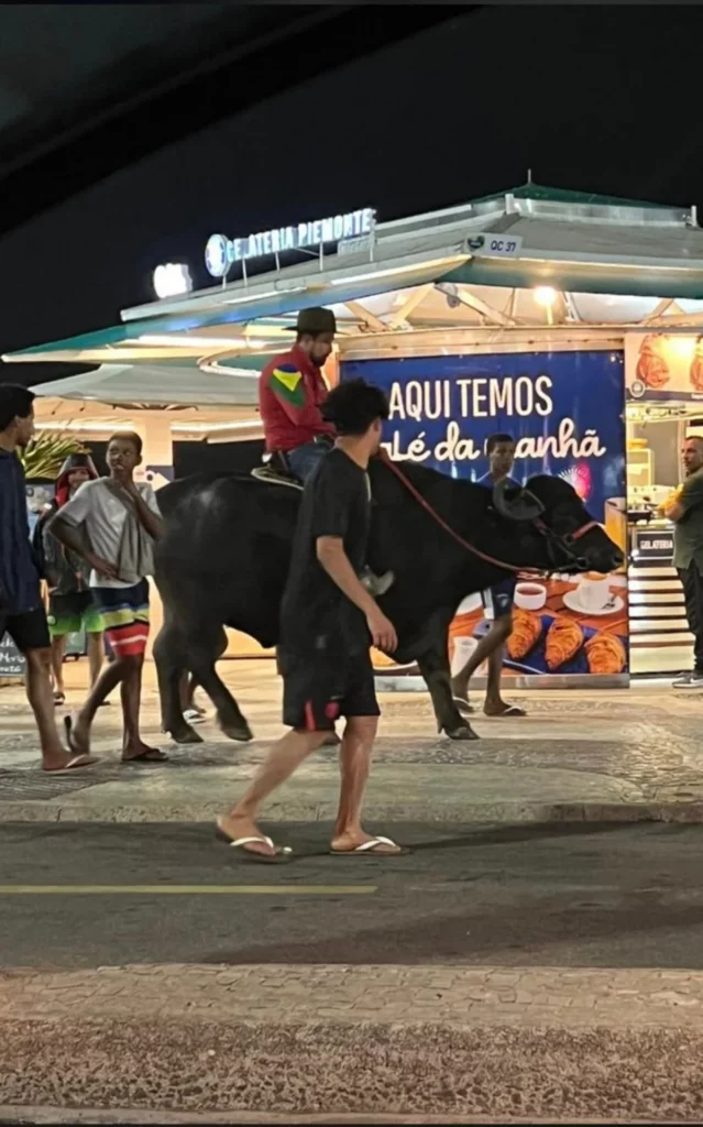 Um homem foi encontrado passeando montado em seu búfalo pela praia, atraindo os olhares curiosos de moradores e turistas que estavam no local.