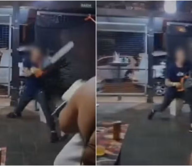 Nas imagens, o homem aparece com a ferramenta ligada enquanto avança na direção dos clientes. No momento seguinte, alguém lança um objeto contra ele. O caso ocorreu no último domingo (23).