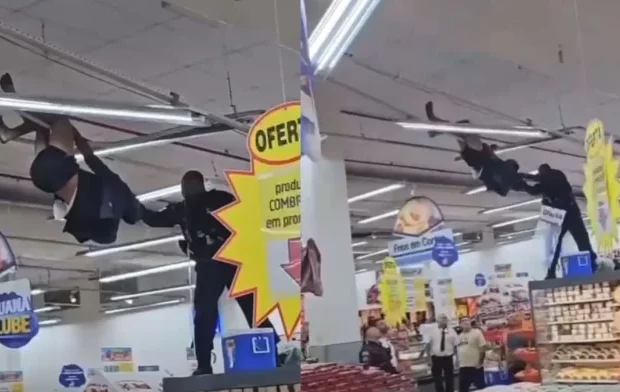 Um homem, ainda não identificado, simplesmente invadiu o supermercado na tarde de sábado (26) na Penha, bairro da Zona Norte do Rio e escalou as prateleiras e ficou pendurado nas luminárias do estabelecimento. Após se recursar a descer, a Polícia Militar foi chamada pela gerência do Supermercado Guanabara.