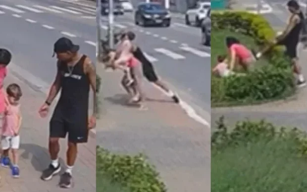 O homem segurando a babá pelos cabelos e jogando-a no chão junto com o menino. Assim que pegar a criança no colo, o homem foi impedido por um pedestre que presenciou a cena e interveio rapidamente, ajudando a babá a resgatar o menino.
