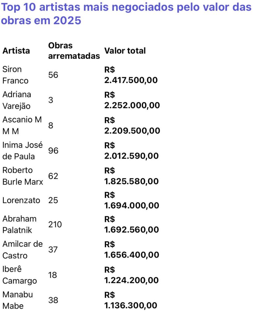 No volume, Aldemir Martins segue como figurinha carimbada no topo. Constância, giro e mercado fiel. No valor, Siron Franco lidera, mostrando que poucas obras bem posicionadas podem mover cifras altas.