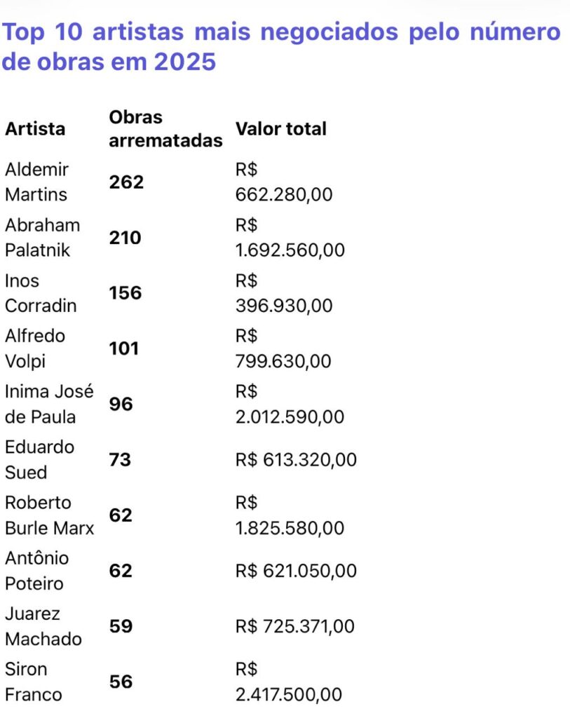 O ranking de 2025 da plataforma não deixa dúvida. Quando o assunto é leilão online, o investidor brasileiro prefere obra de artista brasileiro. E não é por acaso, é por estratégia. Ano após ano, os nomes nacionais dominam o topo das listas, tanto em quantidade de obras vendidas quanto em valor movimentado.