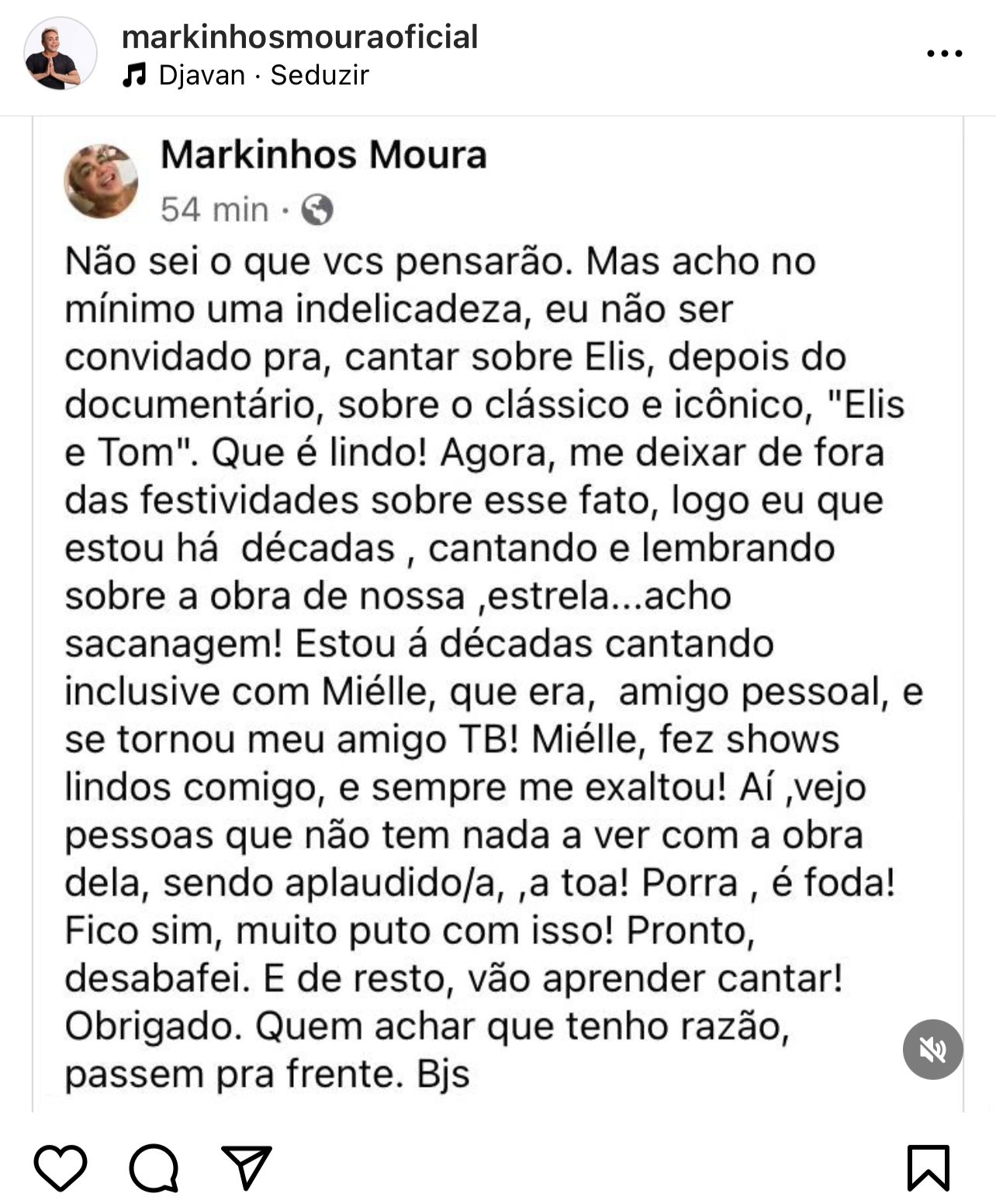 Lembram do Markinhos Moura Meu Mel!? Esse icônico artista da década de 80? Era amigo pessoal e já gravou CD em homenagem à rainha Elis Regina, pois ontem, na noite desta sexta-feira, ele soltou esse comentário na sua página do Facebook. Realmente, não julgo nem um pouco a reação dele. Acho que qualquer um ficaria assim? Imagina, fazem uma documentário de uma grande amiga sua e mesmo sabendo o quão próximos vocês eram antes dela falecer e ninguém te convidar pra participar do projeto é no mínimo revoltante, né amores?